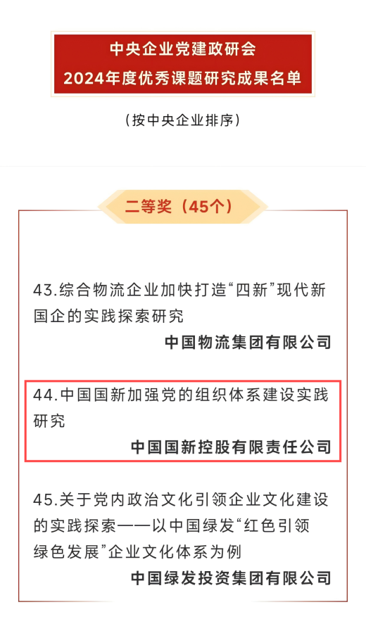 日前,中央企業(yè)黨建思想政治工作研究會(huì)公布2024年度優(yōu)秀課題研究成果和優(yōu)秀課題研究組織單位獲獎(jiǎng)名單。中國(guó)國(guó)新報(bào)送的《加強(qiáng)黨的組織體系建設(shè)實(shí)踐研究》獲2024年度優(yōu)秀課題研究成果二等獎(jiǎng)。