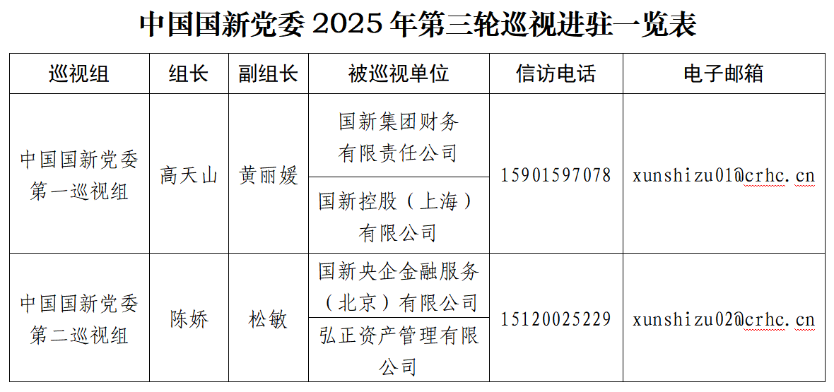 按照中國國新黨委和巡視工作領(lǐng)導(dǎo)小組部署安排,截至9月22日,中國國新黨委第三輪巡視完成進(jìn)駐工作。中國國新黨委2個巡視組將對國新集團(tuán)財務(wù)有限責(zé)任公司、國新央企金融服務(wù)(北京)有限公司、國新控股(上海)有限公司、弘正資產(chǎn)管理有限公司等4家企業(yè)黨支部開展常規(guī)巡視。