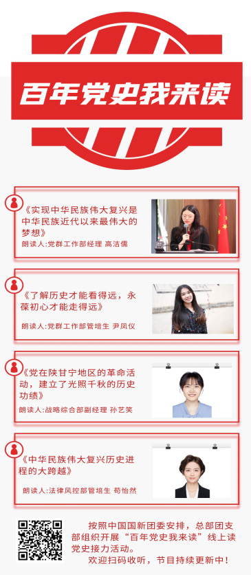 組織開展“百年黨史我來讀”線上讀黨史接力活動,總部團員青年每周輪流朗讀紅色經典、重溫百年黨史,用紅色經典歌曲和沉浸式講解再現(xiàn)中國共產黨波瀾壯闊的百年征程,共同在優(yōu)美的旋律中重溫黨史、感悟初心。舉辦學黨史專題學習沙龍,團員青年們重點圍繞學習習近平總書記在黨史學習教育動員大會上的重要講話精神等內容,結合自身工作崗位交流發(fā)言,進一步堅定了聽黨話、跟黨走、鑄忠誠的信念。