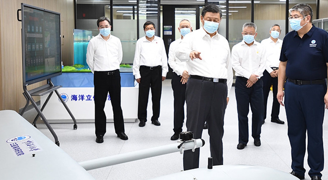 2022年4月11日,習(xí)近平來到中國海洋大學(xué)三亞海洋研究院,了解海洋觀測設(shè)備與信息服務(wù)系統(tǒng)研發(fā)應(yīng)用情況,連線“深海一號”作業(yè)平臺。前方工作人員向總書記匯報了一線工作情況。
