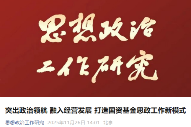 11月26日,《思想政治工作研究》微信公眾號發(fā)布《突出政治領航 融入經(jīng)營發(fā)展 打造國資基金思政工作新模式》,報道國新基金突出政治領航,融入經(jīng)營發(fā)展,探索形成“思政工作引領投資方向、思政工作強化投后賦能、思政工作鍛造投資鐵軍”的國資基金思政工作新模式。現(xiàn)將全文分享如下: