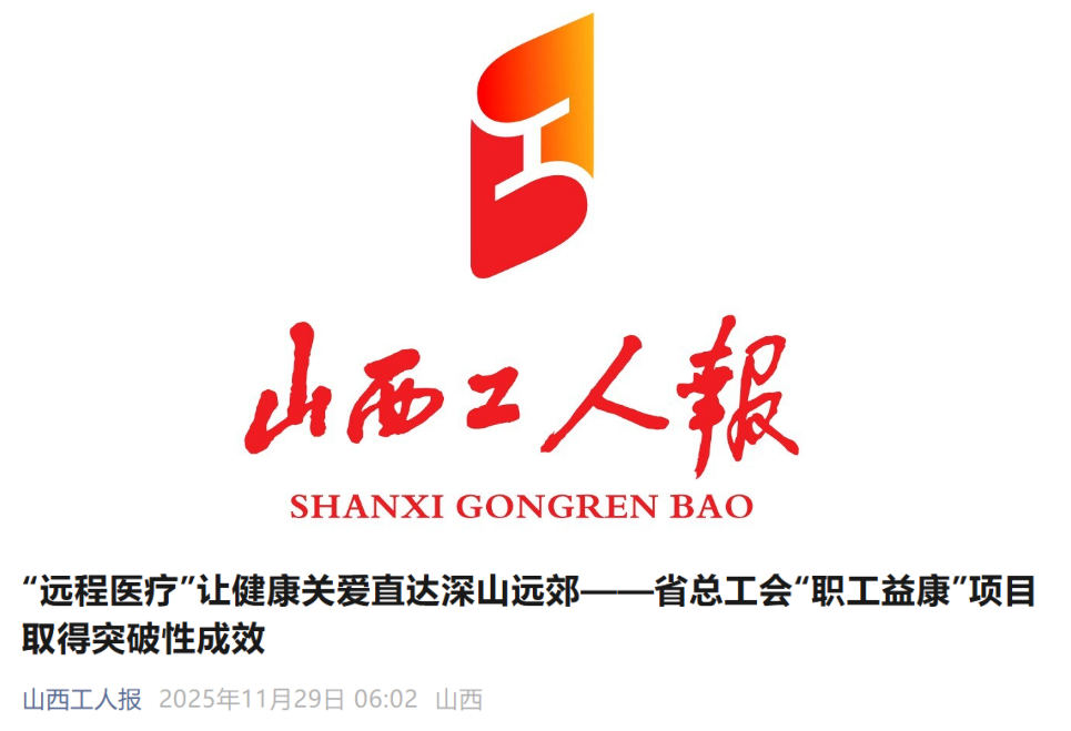 11月29日,《山西工人報》微信公眾號發(fā)布《“遠程醫(yī)療”讓健康關愛直達深山遠郊——省總工會“職工益康”項目取得突破性成效》,報道由山西省總工會推動、中國國新所屬國新健康承接的“職工益康”項目,聚焦偏遠地區(qū)及異地工作的一線職工群體,打破醫(yī)療服務的地域限制、時間限制,讓深山遠郊職工足不出戶享受優(yōu)質醫(yī)療資源,有效破解一線職工“就醫(yī)難”問題,構建起“小病不出門、大病有保障”的健康保障網?,F(xiàn)將全文分享如下: