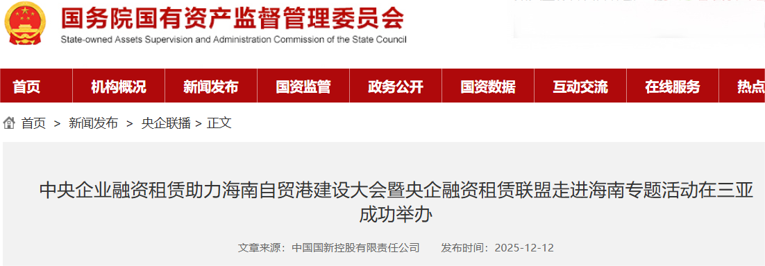 今天,推出系列報道第11期:國務(wù)院國資委網(wǎng)站推出的《中央企業(yè)融資租賃助力海南自貿(mào)港建設(shè)大會暨央企融資租賃聯(lián)盟走進海南專題活動在三亞成功舉辦》。