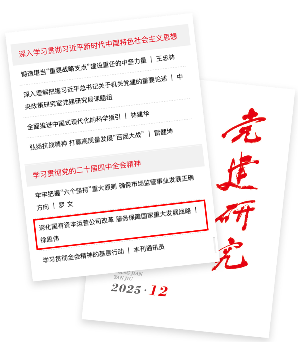 《黨建研究》2025年第12期刊發(fā)中國(guó)國(guó)新黨委書(shū)記、董事長(zhǎng)徐思偉署名文章《深化國(guó)有資本運(yùn)營(yíng)公司改革 服務(wù)保障國(guó)家重大發(fā)展戰(zhàn)略》,介紹中國(guó)國(guó)新深入學(xué)習(xí)貫徹黨的二十屆四中全會(huì)精神,緊扣國(guó)有資本運(yùn)營(yíng)公司功能使命,著力將黨建優(yōu)勢(shì)轉(zhuǎn)化為發(fā)展動(dòng)能,在服務(wù)國(guó)資央企、落實(shí)國(guó)家重大發(fā)展戰(zhàn)略中挺膺擔(dān)當(dāng)、展現(xiàn)作為的實(shí)踐探索和工作成效?,F(xiàn)將全文轉(zhuǎn)載如下: