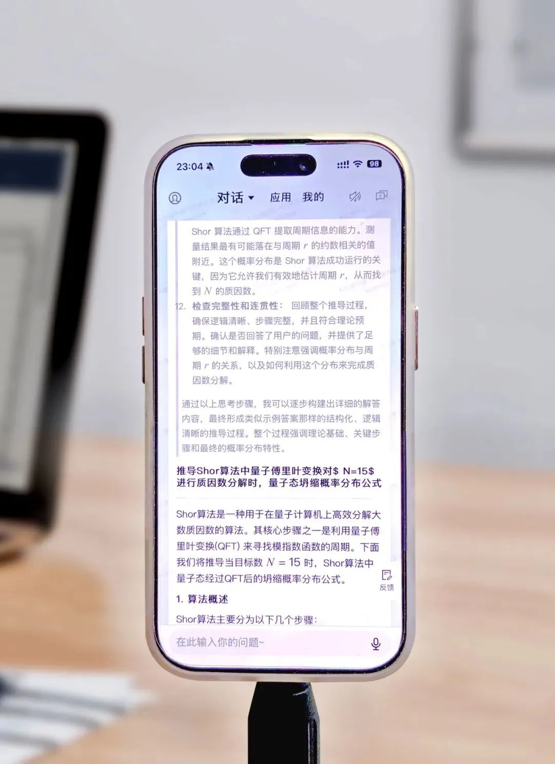 “九天”在推導(dǎo)Shor算法進(jìn)行質(zhì)因數(shù)分解時(shí),量子傅立葉變換后的量子態(tài)坍縮概率分布公式,模型基于周期性態(tài)和量子傅立葉變換的數(shù)學(xué)性質(zhì)計(jì)算測(cè)量結(jié)果的概率