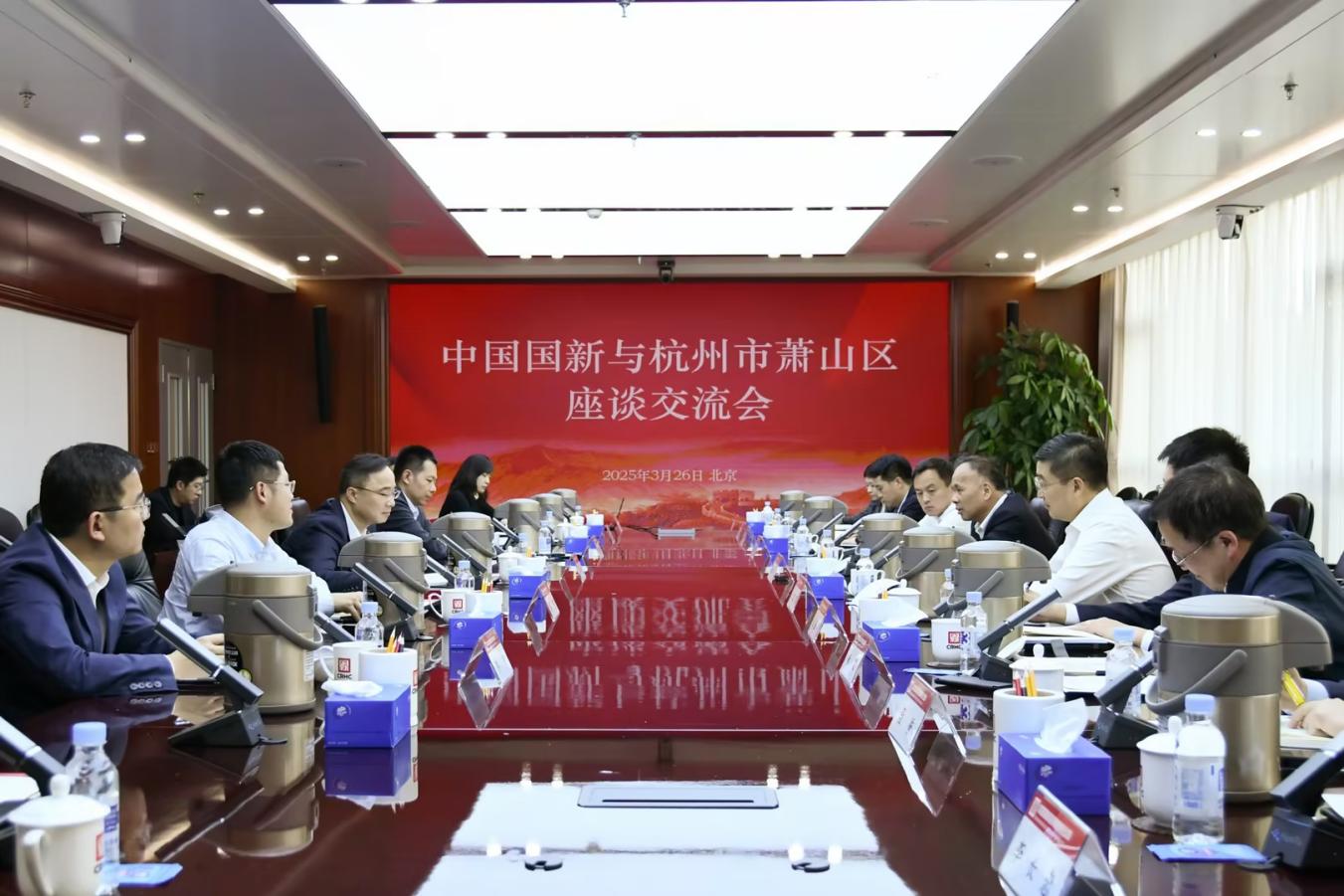 3月26日,中國國新黨委副書記、董事、總經(jīng)理莫德旺在公司總部會見杭州市委常委、蕭山區(qū)委書記孫旭東。中國國新黨委副書記、董事黃耀文參加會見。