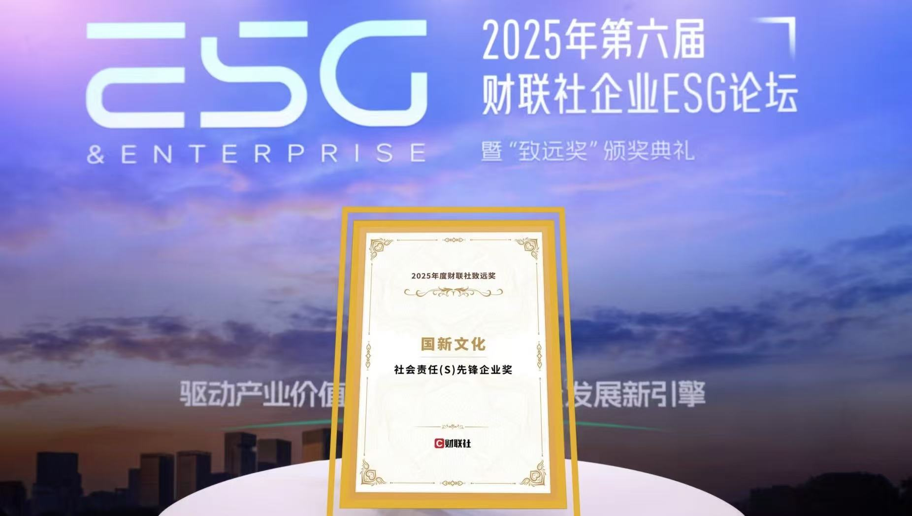 10月31日,2025年第六屆財(cái)聯(lián)社企業(yè)ESG論壇暨“致遠(yuǎn)獎”頒獎典禮在北京舉行。國新文化獲財(cái)聯(lián)社致遠(yuǎn)獎“社會責(zé)任先鋒企業(yè)獎”。