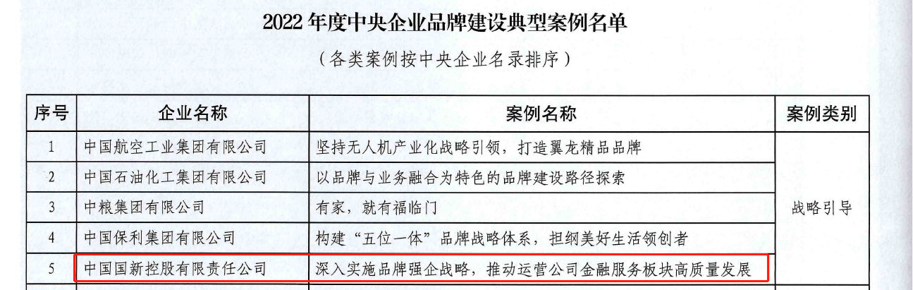 日前,國(guó)務(wù)院國(guó)資委公布了“2022年度國(guó)有企業(yè)品牌建設(shè)典型案例和優(yōu)秀品牌故事名單”。中國(guó)國(guó)新選送的《深入實(shí)施品牌強(qiáng)企戰(zhàn)略,推動(dòng)運(yùn)營(yíng)公司金融服務(wù)板塊高質(zhì)量發(fā)展》案例入選“2022年度中央企業(yè)品牌建設(shè)典型案例”。