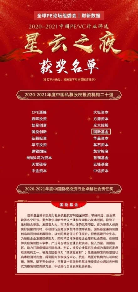 9月5日,在全球PE論壇發(fā)布的“2020-2021年度中國(guó)PE/VC行業(yè)榜單”中,國(guó)新基金獲得“中國(guó)私募股權(quán)投資機(jī)構(gòu)二十強(qiáng)”“中國(guó)股權(quán)投資行業(yè)卓越社會(huì)責(zé)任獎(jiǎng)”兩個(gè)獎(jiǎng)項(xiàng)。