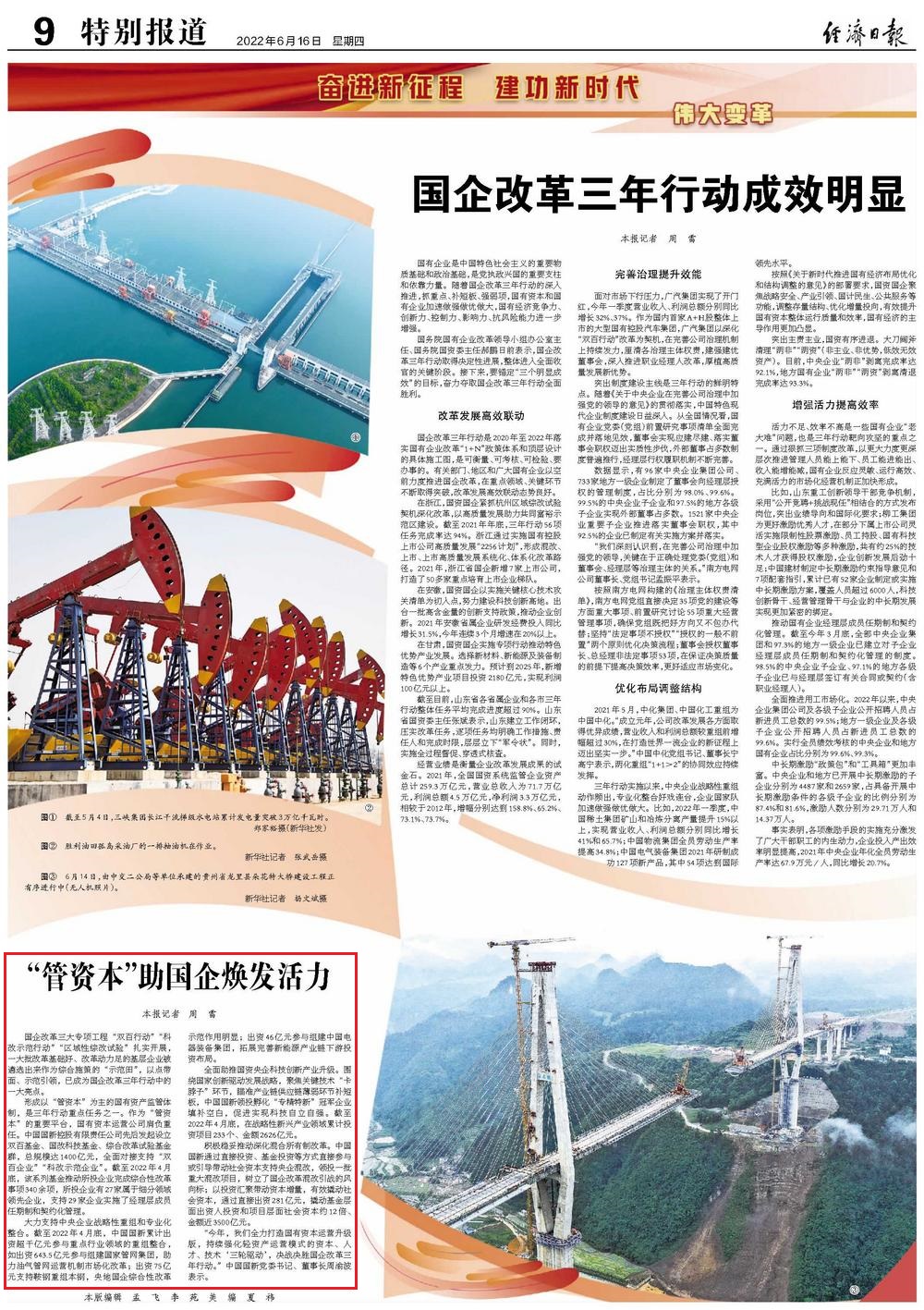 2022年6月16日出刊的《經(jīng)濟(jì)日報(bào)》在“奮進(jìn)新征程 建功新時(shí)代·偉大變革”推出特別報(bào)道《國企改革三年行動(dòng)成效明顯》,深入報(bào)道了國企改革三年行動(dòng)取得的決定性進(jìn)展和重要成效。報(bào)道同時(shí)配發(fā)《“管資本”助國企煥發(fā)活力》一文,專門報(bào)道了中國國新如何聚焦改革三年行動(dòng),強(qiáng)化運(yùn)營公司功能作用,服務(wù)央企改革發(fā)展?,F(xiàn)將全文分享如下: