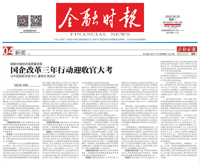 2022年6月20日,《金融時(shí)報(bào)》刊發(fā)專訪中國國新黨委書記、董事長周渝波文章《賦能中國經(jīng)濟(jì)高質(zhì)量發(fā)展 國企改革三年行動(dòng)迎收官大考》?,F(xiàn)全文分享如下: