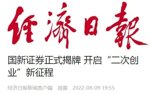 8月8日下午,國新證券股份有限公司揭牌儀式暨全體員工大會在京舉行?!督?jīng)濟日報》聚焦國新證券“二次創(chuàng)業(yè)”,8月9日刊載《國新證券正式揭牌 開啟“二次創(chuàng)業(yè)”新征程》一文,現(xiàn)將全文分享如下:
