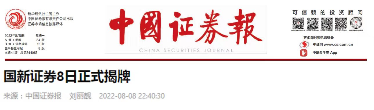 2022年8月8日,中國證券報(bào)關(guān)注國新證券揭牌儀式,刊載《國新證券8日正式揭牌》一文。現(xiàn)將原文內(nèi)容分享如下:
