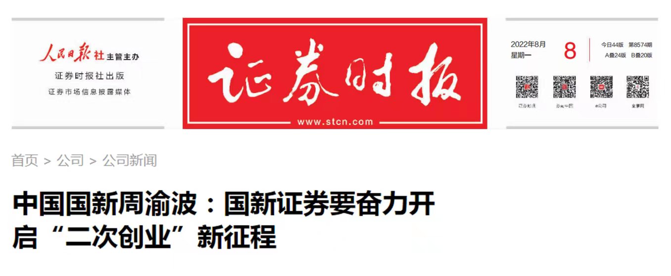 2022年8月8日,國(guó)新證券舉行揭牌儀式暨全體員工大會(huì),證券時(shí)報(bào)聚焦國(guó)新證券“二次創(chuàng)業(yè)”新征程,發(fā)布報(bào)道《中國(guó)國(guó)新周渝波:國(guó)新證券要奮力開(kāi)啟“二次創(chuàng)業(yè)”新征程》?,F(xiàn)將原文內(nèi)容轉(zhuǎn)載如下: