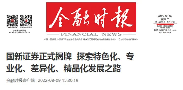 8月8日下午,國新證券股份有限公司揭牌儀式暨全體員工大會在京舉行?!督鹑跁r報》聚焦國新證券“二次創(chuàng)業(yè)”,8月9日刊載《國新證券正式揭牌 探索特色化、專業(yè)化、差異化、精品化發(fā)展之路》一文,現(xiàn)將全文分享如下: