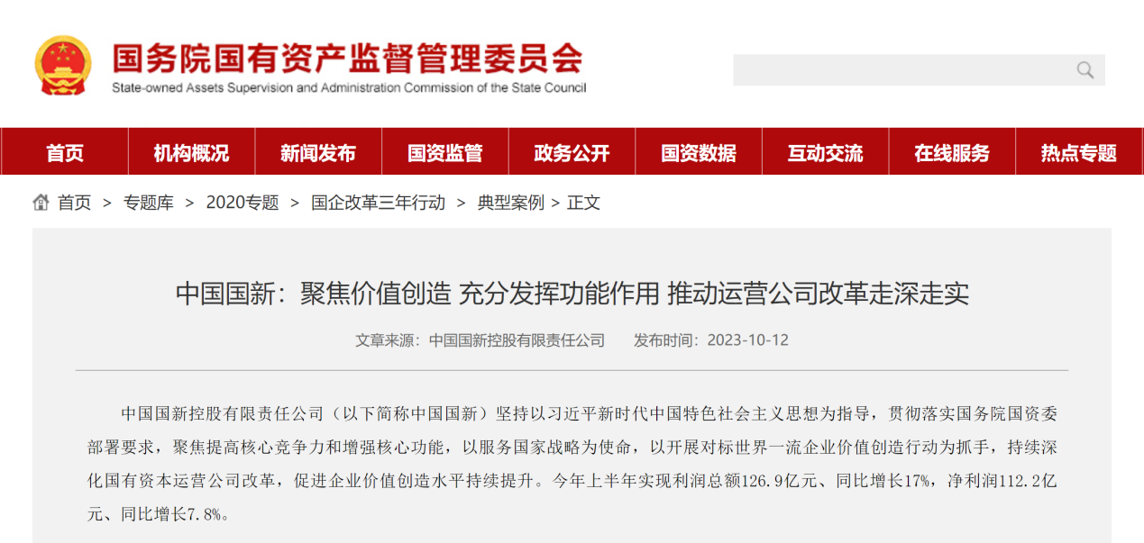 10月12日,國資委網(wǎng)站“國企改革三年行動”專欄刊載《中國國新:聚焦價值創(chuàng)造 充分發(fā)揮功能作用 推動運營公司改革走深走實》一文,報道中國國新以開展對標(biāo)世界一流企業(yè)價值創(chuàng)造行動為抓手,持續(xù)深化國有資本運營公司改革,促進(jìn)企業(yè)價值創(chuàng)造水平持續(xù)提升。現(xiàn)全文分享如下: