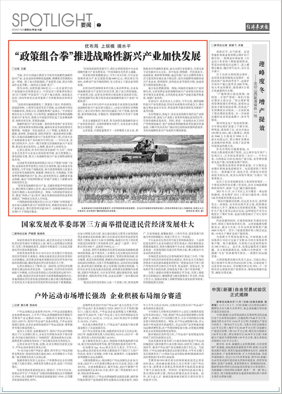 11月2日,《經(jīng)濟(jì)參考報(bào)》刊發(fā)文章《“政策組合拳”推進(jìn)戰(zhàn)略性新興產(chǎn)業(yè)加快發(fā)展》,報(bào)道中國(guó)國(guó)新加大戰(zhàn)略性新興產(chǎn)業(yè)投資布局,積極籌設(shè)中央企業(yè)戰(zhàn)略性新興產(chǎn)業(yè)發(fā)展基金?,F(xiàn)全文分享如下: