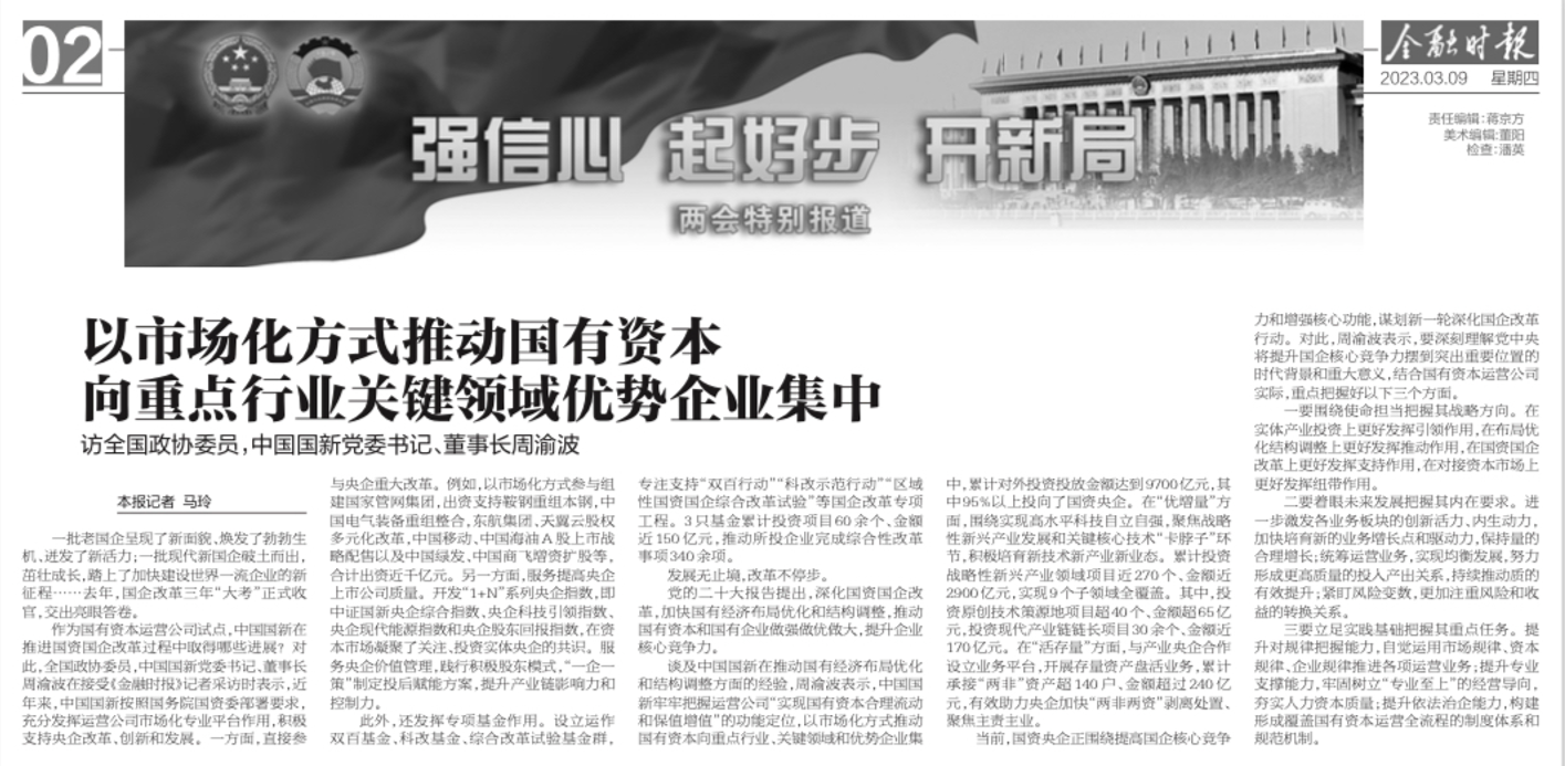 作為國有資本運營公司試點,中國國新在推進國資國企改革過程中取得哪些進展?對此,全國政協(xié)委員,中國國新黨委書記、董事長周渝波在接受《金融時報》記者采訪時表示,近年來,中國國新按照國務(wù)院國資委部署要求,充分發(fā)揮運營公司市場化專業(yè)平臺作用,積極支持央企改革、創(chuàng)新和發(fā)展。一方面,直接參與央企重大改革。例如,以市場化方式參與組建國家管網(wǎng)集團,出資支持鞍鋼重組本鋼,中國電氣裝備重組整合,東航集團、天翼云股權(quán)多元化改革,中國移動、中國海油A股上市戰(zhàn)略配售以及中國綠發(fā)、中國商飛增資擴股等,合計出資近千億元。另一方面,服務(wù)提高央企上市公司質(zhì)量。開發(fā)“1+N”系列央企指數(shù),即中證國新央企綜合指數(shù)、央企科技引領(lǐng)指數(shù)、央企現(xiàn)代能源指數(shù)和央企股東回報指數(shù),在資本市場凝聚了關(guān)注、投資實體央企的共識。服務(wù)央企價值管理,踐行積極股東模式,“一企一策”制定投后賦能方案,提升產(chǎn)業(yè)鏈影響力和控制力。