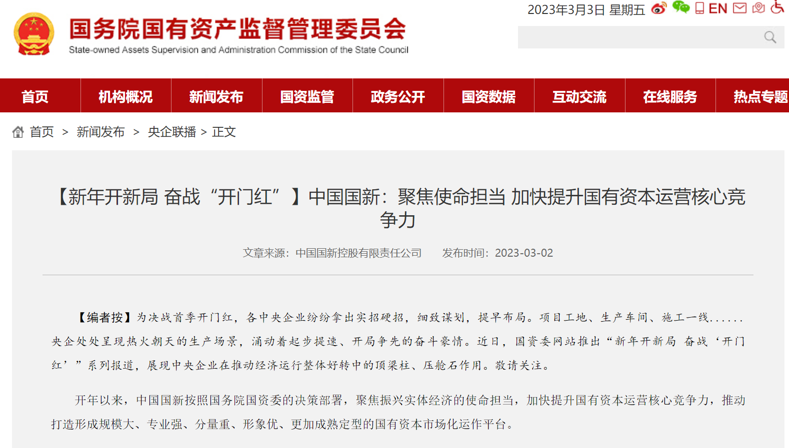 3月2日,國資委官網(wǎng)“新年開新局 奮戰(zhàn)‘開門紅’”專題中發(fā)布《中國國新:聚焦使命擔(dān)當(dāng) 加快提升國有資本運營核心競爭力》一文,從聚焦助力實體經(jīng)濟、大力支持科技創(chuàng)新、著力提升核心競爭力三個方面,報道中國國新開年以來,以“開局就攻堅、起步即加速”的勁頭,推動打造形成規(guī)模大、專業(yè)強、分量重、形象優(yōu)、更加成熟定型的國有資本市場化運作平臺?,F(xiàn)為您全文分享如下: