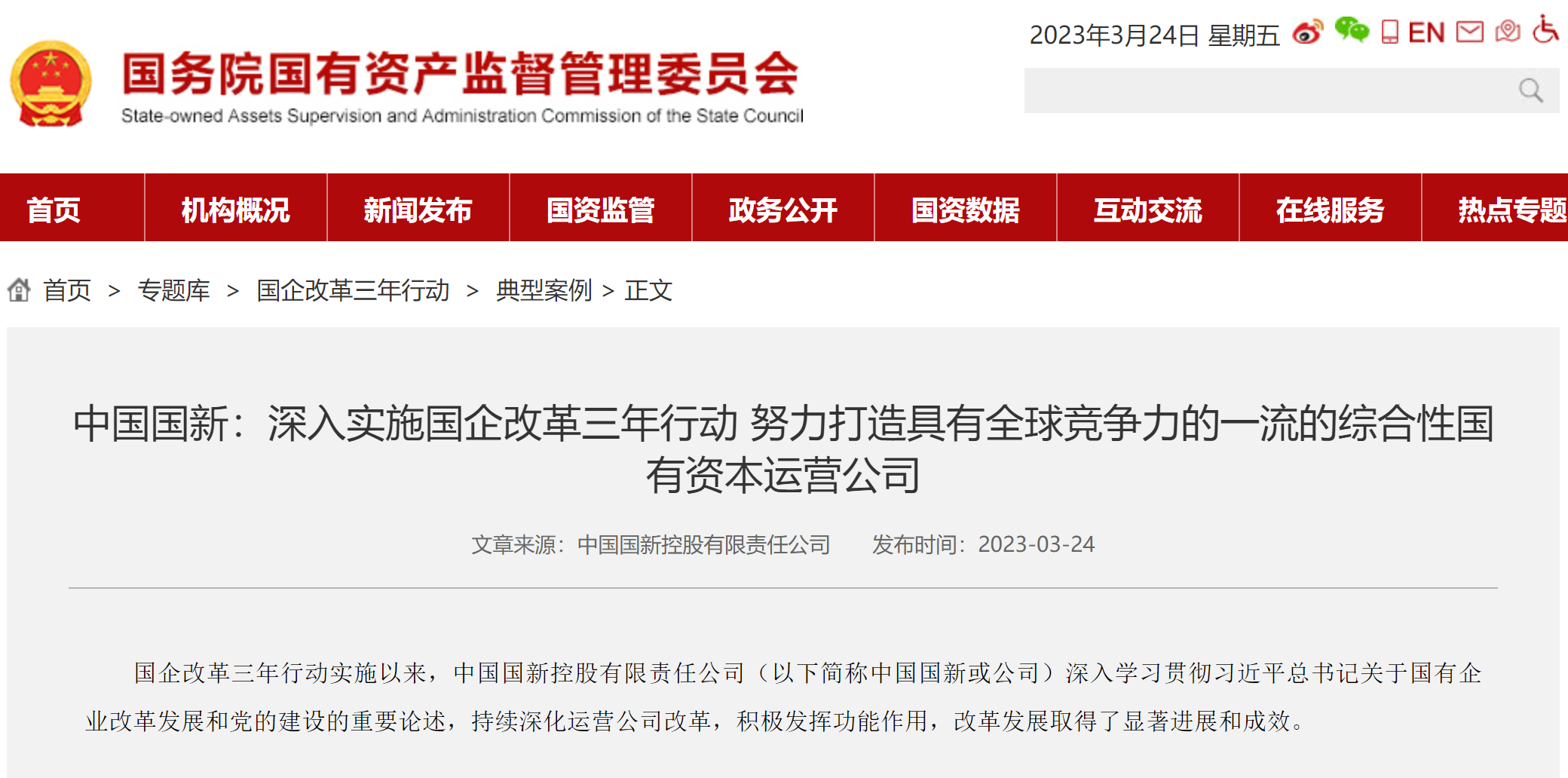 3月24日,國資委網(wǎng)站“國企改革三年行動”專欄刊載《中國國新:深入實施國企改革三年行動 努力打造具有全球競爭力的一流的綜合性國有資本運營公司》一文,從增強運營公司核心功能、完善中國特色現(xiàn)代企業(yè)制度、深化市場化機制、加強黨的領(lǐng)導(dǎo)黨的建設(shè)等四方面,報道中國國新持續(xù)深化運營公司改革,積極發(fā)揮功能作用。現(xiàn)將全文分享如下: