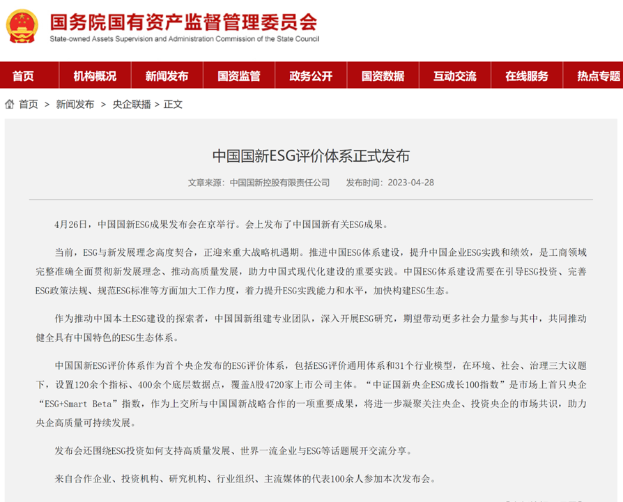 4月26日下午,“中國國新ESG成果發(fā)布會”在京舉行。4月28日,國資委網站聚焦“中證國新央企ESG成長100指數”發(fā)布,推進中國ESG體系建設,助力推動健全具有中國特色的ESG生態(tài)體系?,F為您全文分享如下: