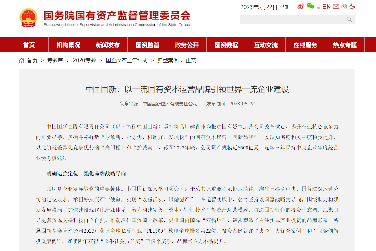 5月22日,國資委網(wǎng)站“國企改革三年行動”專欄刊載《中國國新:以一流國有資本運(yùn)營品牌引領(lǐng)世界一流企業(yè)建設(shè)》一文,從明確運(yùn)營定位、拓展業(yè)務(wù)布局、培育企業(yè)文化、加強(qiáng)機(jī)制建設(shè)等四方面,報(bào)道中國國新多措并舉打造“形象新、業(yè)務(wù)優(yōu)、機(jī)制好、發(fā)展快”的國有資本運(yùn)營“國新品牌”。現(xiàn)將全文分享如下: