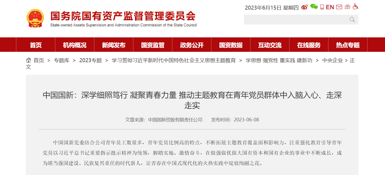 6月8日國資委網(wǎng)站刊載《中國國新深學(xué)細(xì)照篤行 凝聚青春力量 推動主題教育在青年黨員群體中入腦入心、走深走實(shí)》,從“突出政治引領(lǐng) 筑牢跟黨走的堅(jiān)強(qiáng)信念”“突出學(xué)思踐悟 夯實(shí)理論武裝根基”“突出求真務(wù)實(shí) 堅(jiān)持問題導(dǎo)向開展調(diào)研研究”“突出實(shí)干擔(dān)當(dāng) 匯聚起奮進(jìn)新征程的青春力量”四個方面,介紹中國國新黨委強(qiáng)化教育引導(dǎo)青年黨員,推動主題教育在青年黨員群體中入腦入心、走深走實(shí)。