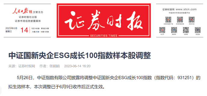 6月14日,證券時報刊載《中證國新央企ESG成長100指數樣本股調整》,報道中證國新央企ESG成長100指數調整42只成份股已于6月9日正式生效。現全文分享如下: