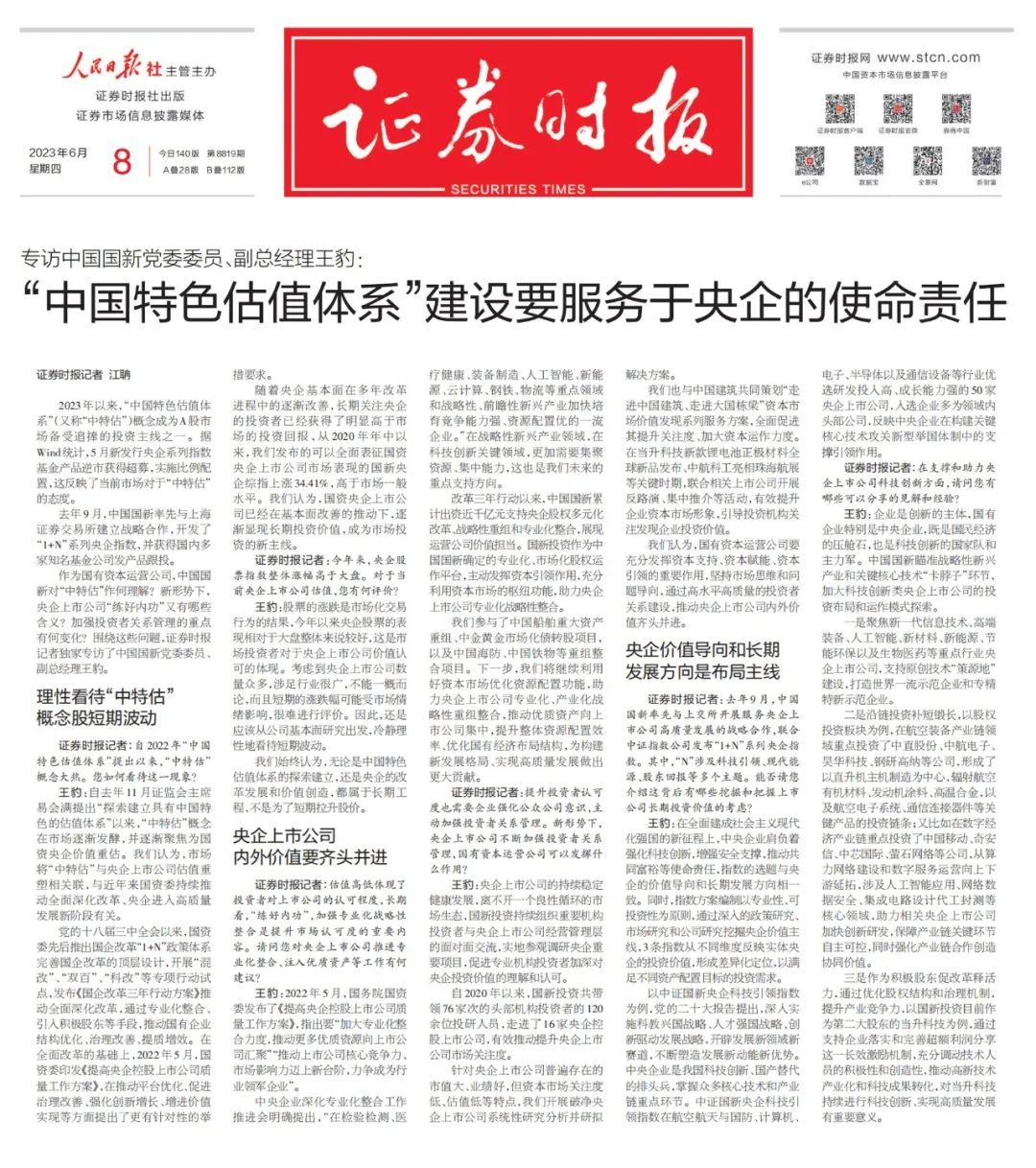6月8日,證券時報專訪中國國新黨委委員、副總經(jīng)理王豹,刊載《“中國特色估值體系”建設要服務于央企的使命責任》一文,圍繞對“中特估”的理解,新形勢下央企上市公司“練好內(nèi)功”,加強投資者關系管理等進行報道?,F(xiàn)將全文分享如下:
