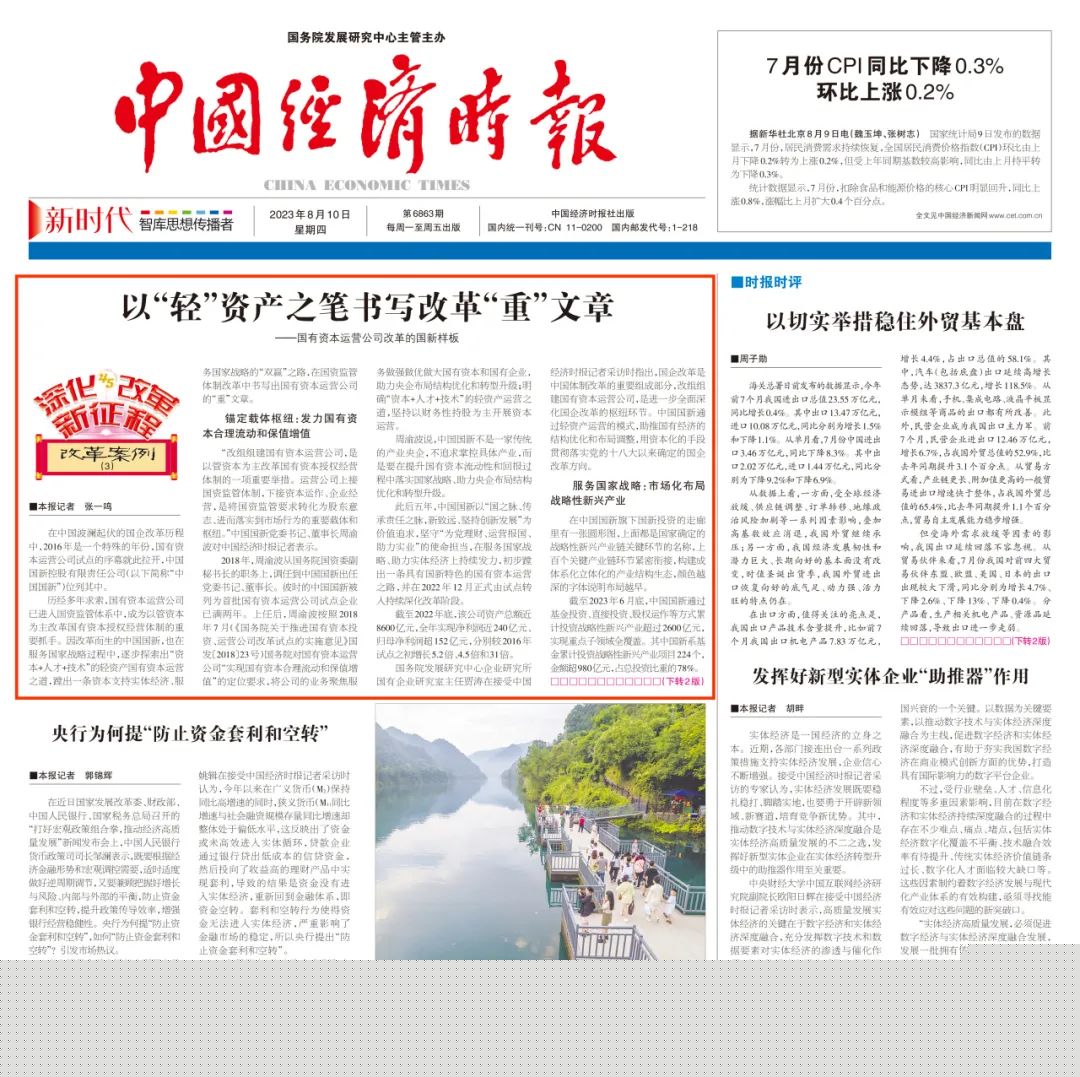 8月10日,中國經(jīng)濟時報頭版頭條刊載“深化改革新征程”系列改革案例之《以“輕”資產(chǎn)之筆書寫改革“重”文章——國有資本運營公司改革的國新樣板》,報道了中國國新以“資本+人才+技術(shù)”的輕資產(chǎn)國有資本運營之道,蹚出一條資本支持實體經(jīng)濟、服務(wù)國家戰(zhàn)略的“雙贏”之路?,F(xiàn)將全文分享如下: