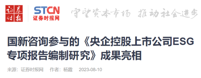 8月10日,證券時(shí)報(bào)聚焦國(guó)資委ESG相關(guān)課題《央企控股上市公司ESG專項(xiàng)報(bào)告編制研究》,報(bào)道國(guó)新咨詢?nèi)虆⑴c課題研究并助力相關(guān)成果落地應(yīng)用。現(xiàn)全文分享如下: