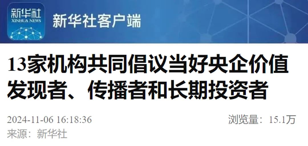 今天,推出相關(guān)報(bào)道第1篇:新華社11月6日刊發(fā)的《13家機(jī)構(gòu)共同倡議當(dāng)好央企價(jià)值發(fā)現(xiàn)者、傳播者和長(zhǎng)期投資者》。