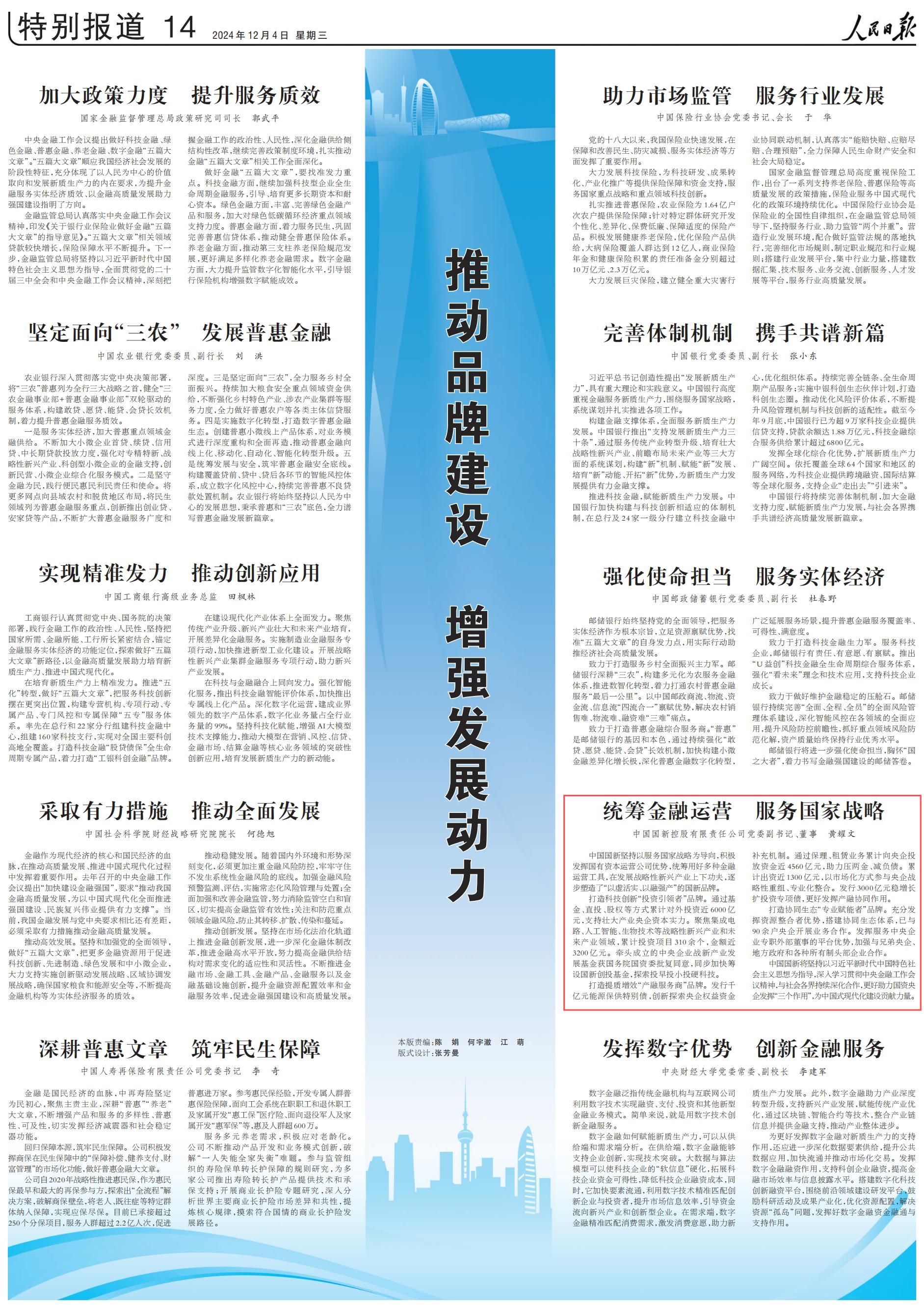 11月29日,中國國新黨委副書記、董事黃耀文應(yīng)邀出席2024中國品牌論壇“金融高質(zhì)量發(fā)展案例報(bào)告會”并作主旨發(fā)言。12月4日出版的《人民日報(bào)》,以《統(tǒng)籌金融運(yùn)營 服務(wù)國家戰(zhàn)略》為題,在“特別報(bào)道”專欄刊發(fā)了黃耀文主旨發(fā)言的主要內(nèi)容。現(xiàn)將全文分享如下:?