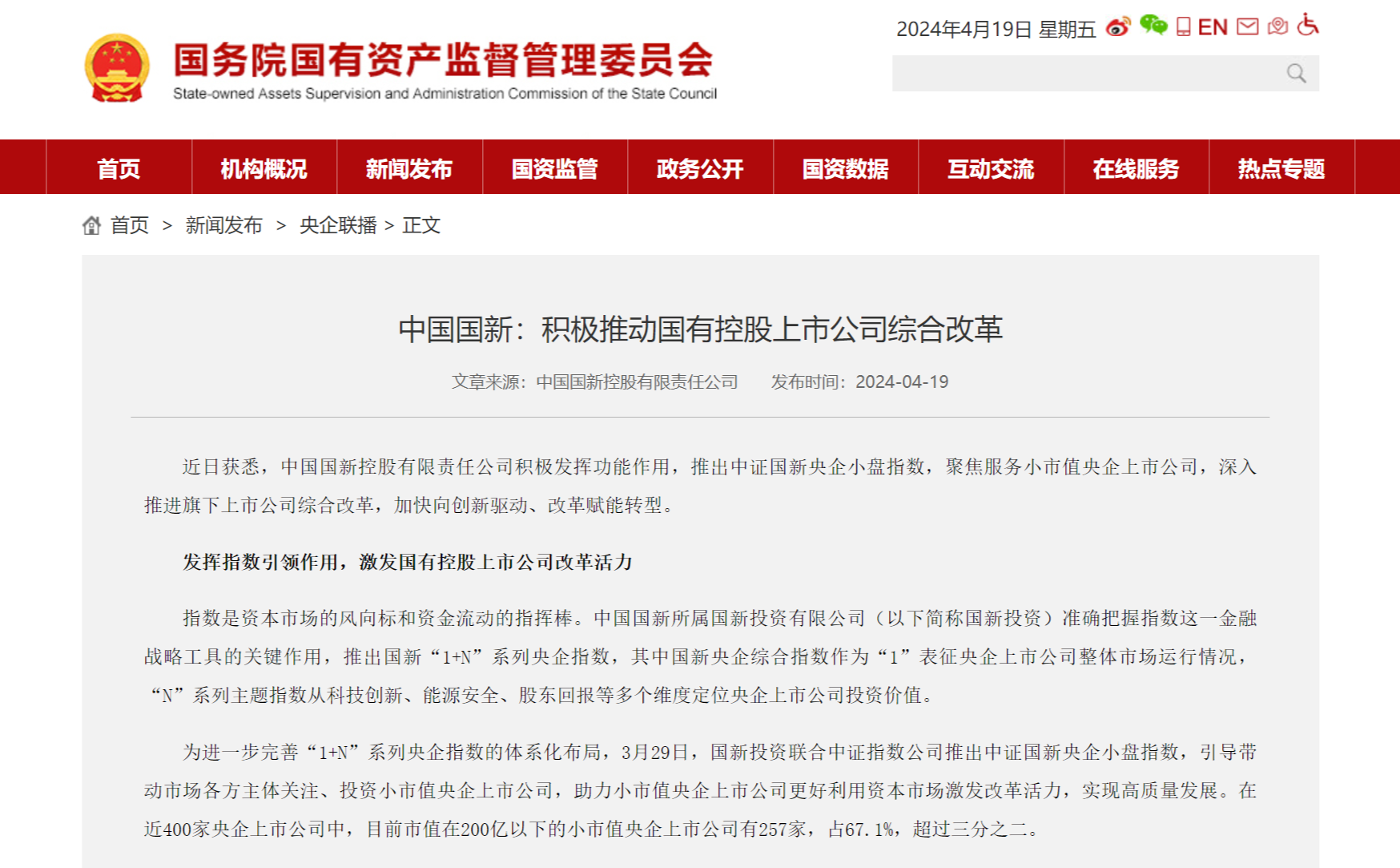 4月19日,國(guó)務(wù)院國(guó)資委網(wǎng)站發(fā)布《中國(guó)國(guó)新積極推動(dòng)國(guó)有控股上市公司綜合改革》,報(bào)道中國(guó)國(guó)新充分發(fā)揮國(guó)有資本運(yùn)營(yíng)公司功能作用,以指數(shù)引領(lǐng)聚焦小市值央企上市公司,不斷提升旗下上市公司核心競(jìng)爭(zhēng)力,以深化綜合改革推動(dòng)國(guó)有控股上市公司實(shí)現(xiàn)高質(zhì)量發(fā)展。現(xiàn)全文分享如下: