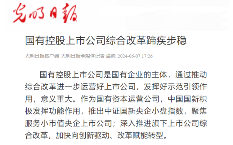 6月7日,光明日報發(fā)布《國有控股上市公司綜合改革蹄疾步穩(wěn)》,聚焦中國國新積極發(fā)揮功能作用,激發(fā)國有控股上市公司改革活力,以改革深化助推國有控股上市公司提升核心競爭力,推動實現(xiàn)高質(zhì)量發(fā)展。