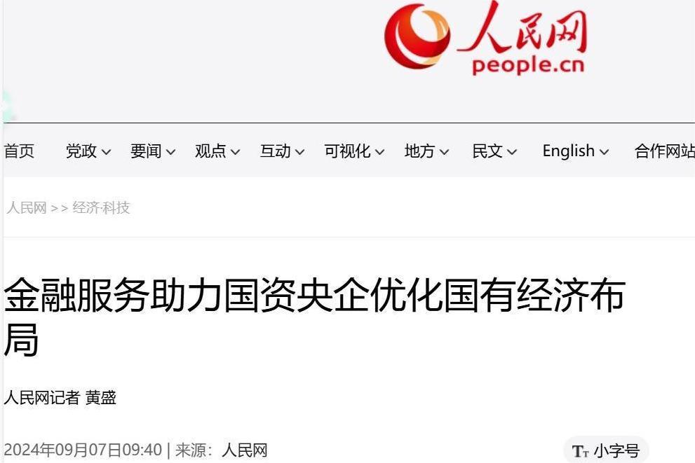 今天,推出相關(guān)報(bào)道第3篇:《人民網(wǎng)》9月7日刊載的《金融服務(wù)助力國(guó)資央企優(yōu)化國(guó)有經(jīng)濟(jì)布局》。