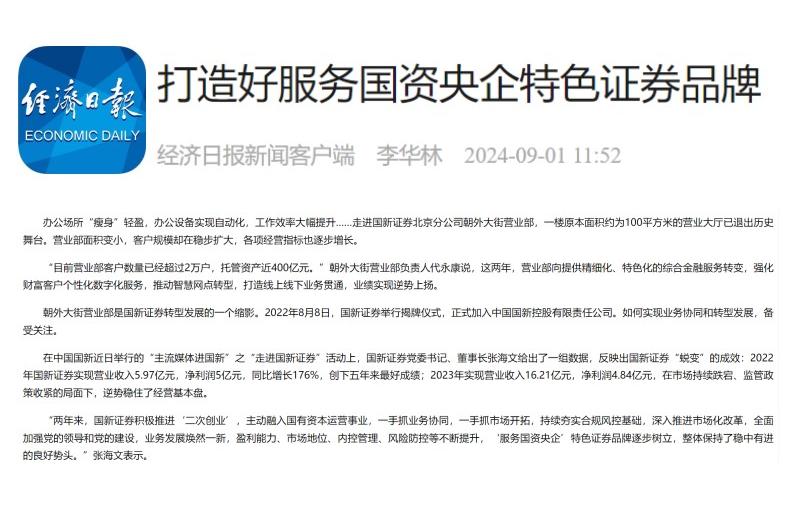 今天,推出相關(guān)報(bào)道第2篇:《經(jīng)濟(jì)日?qǐng)?bào)》9月1日刊載的《打造好服務(wù)國資央企特色證券品牌》。