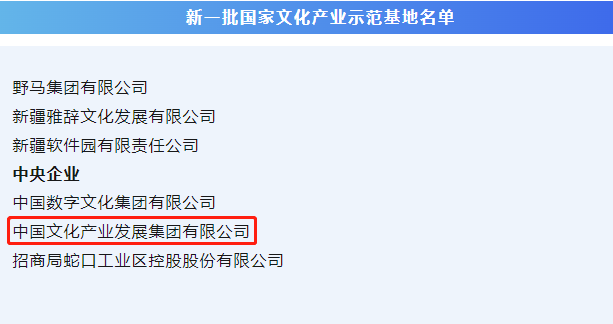 日前,文化和旅游部公布新一批國家文化產(chǎn)業(yè)示范基地名單,中國國新所屬中國文化產(chǎn)業(yè)發(fā)展集團有限公司(以下簡稱中文發(fā)集團)成功入選,這是公司系統(tǒng)內(nèi)第一個國家級文化產(chǎn)業(yè)示范基地。