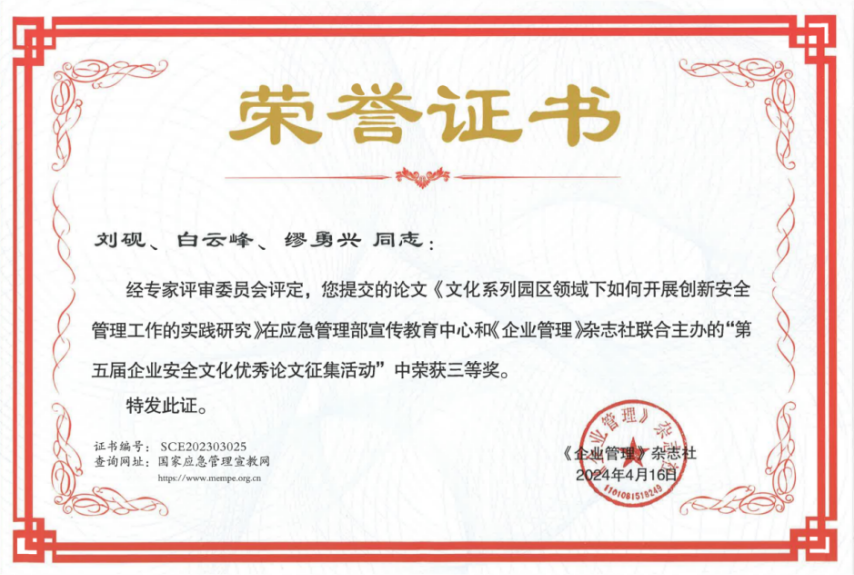 日前,國家應急管理宣教網(wǎng)公布了第五屆企業(yè)安全文化優(yōu)秀論文獲獎名單,中文發(fā)集團所屬中國印刷有限公司(以下簡稱印刷公司)選送的論文《文化系列園區(qū)領(lǐng)域下如何開展創(chuàng)新安全管理工作的實踐研究》獲“三等獎”,并將收錄于《第五屆全國企業(yè)安全文化優(yōu)秀論文集》。